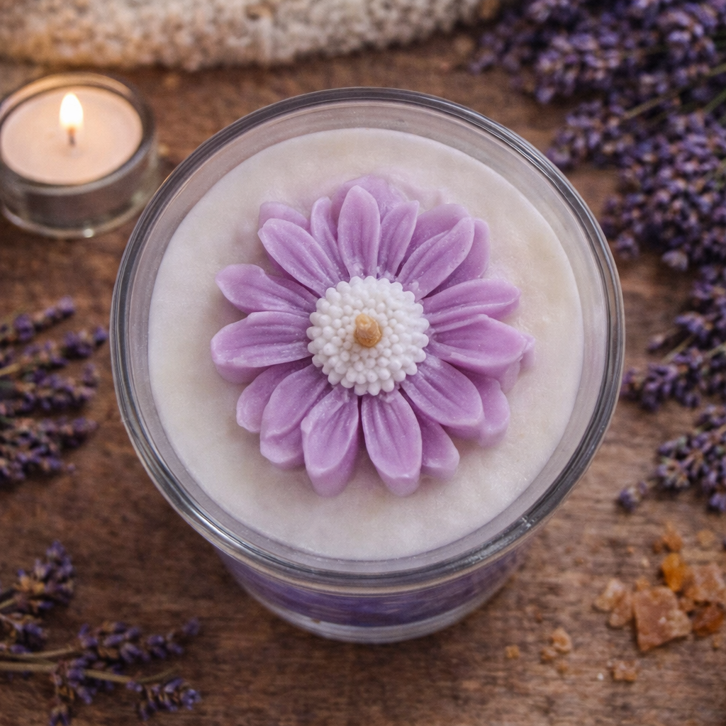 Povrch svíčky zdobí dekorativní květ ze sójového vosku, který jí dodává jemný a elegantní vzhled.