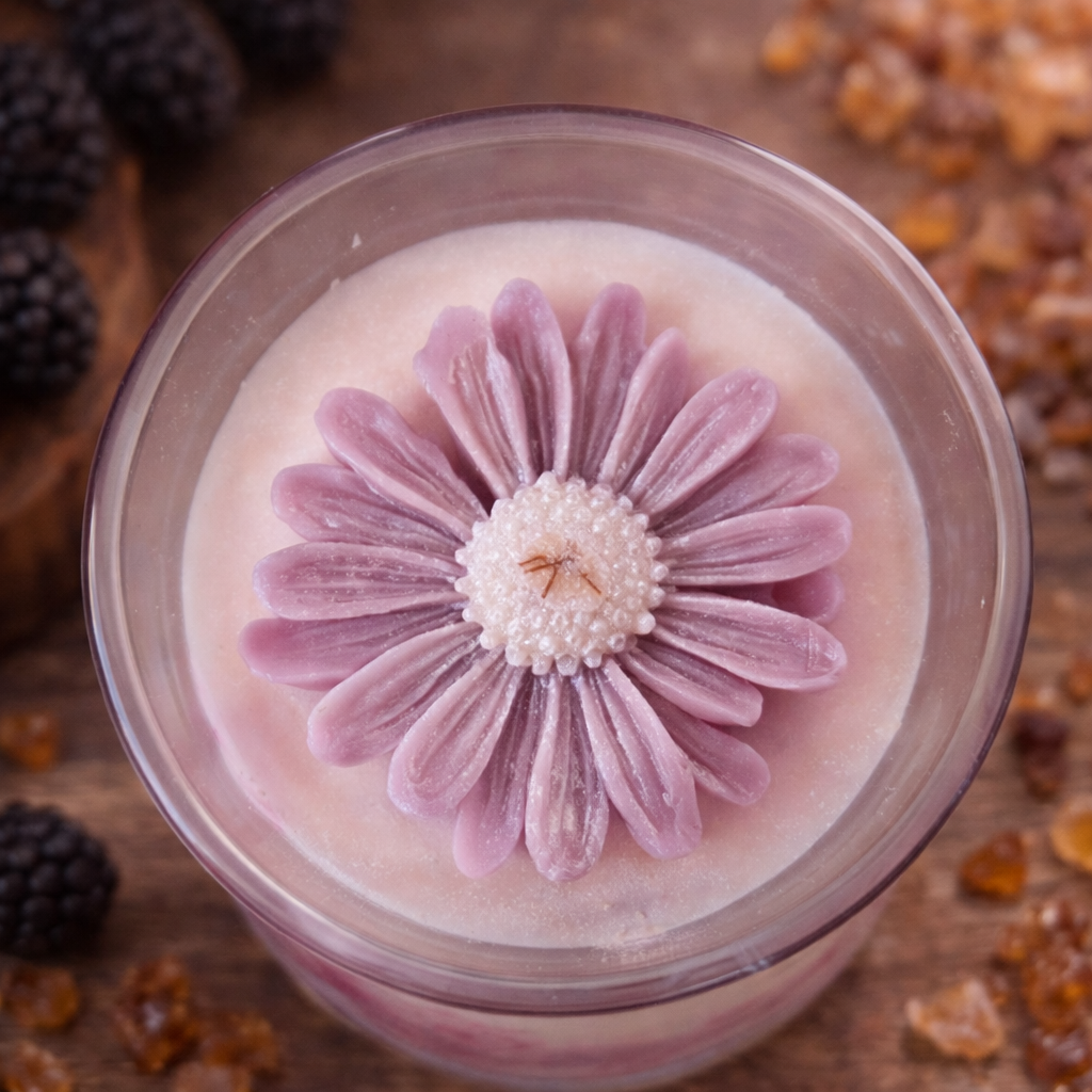 Povrch svíčky zdobí dekorativní květ ze sójového vosku, který jí dodává jemný a elegantní vzhled.