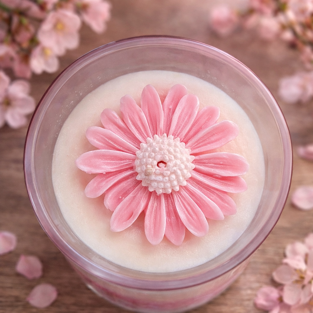 Povrch svíčky zdobí dekorativní květ ze sójového vosku, který jí dodává jemný a elegantní vzhled.