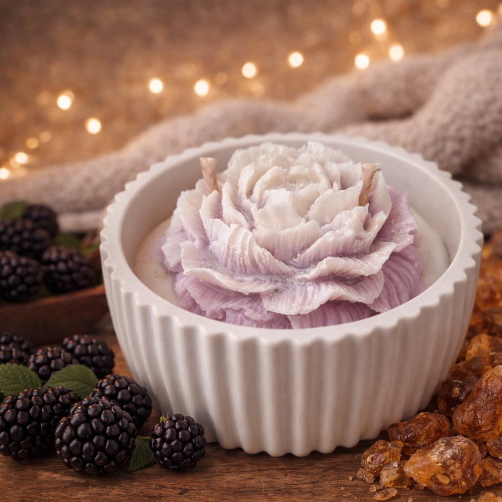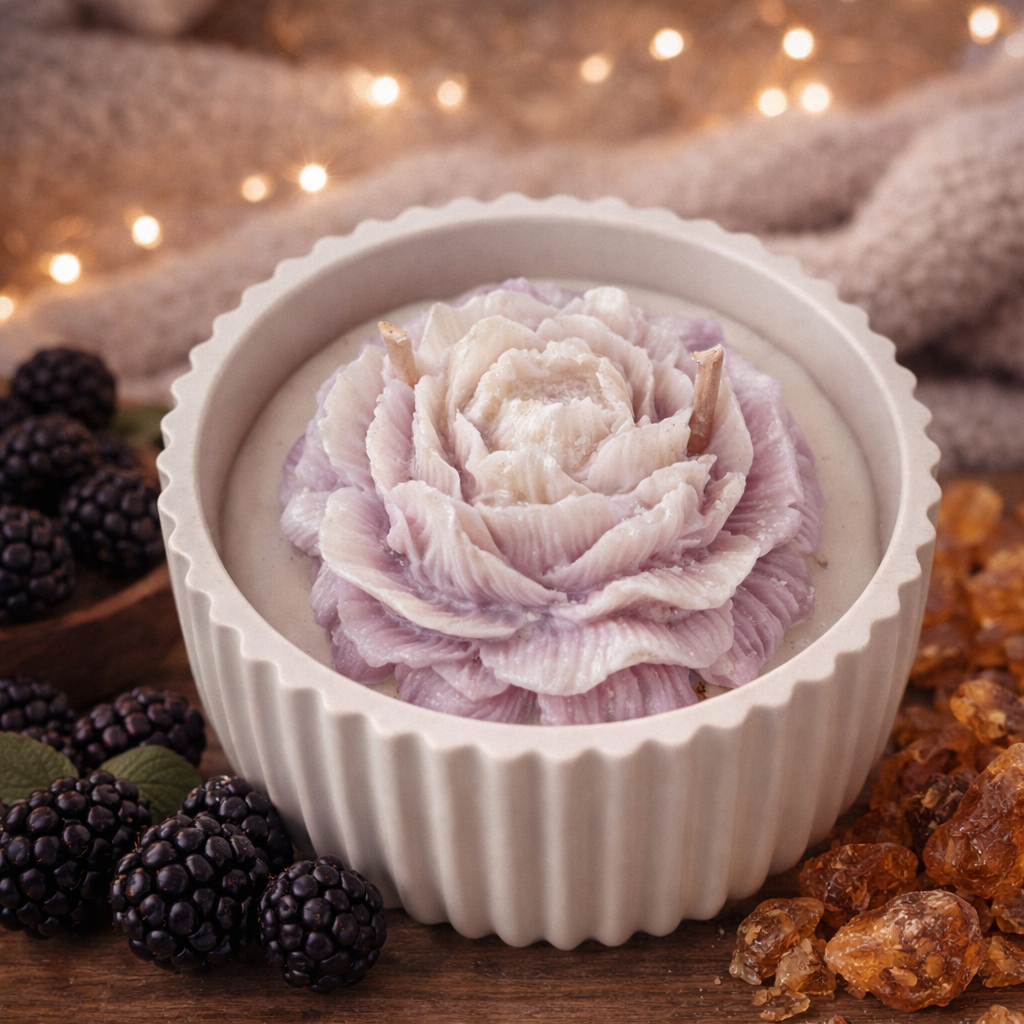 Přírodní krása, smyslná vůně a elegantní design – to vše spojuje naše ručně vyráběná sójová svíčka, která promění váš domov v hygge oázu. Sladké tóny šťavnatých ostružin se snoubí s hřejivým, dřevitým aroma jantaru a vytvářejí luxusní, uklidňující atmosféru. Povrch svíčky krášlí velký květ ze sójového vosku, který dodává svíčce jedinečný vzhled. Elegantní nádoba je po dohoří svíčky znovu použitelná, skvěle doplní jakýkoli interiér. 100% přírodní sójový vosk hoří čistě, bez toxinů a vydrží déle než běžné parafínové svíčky.